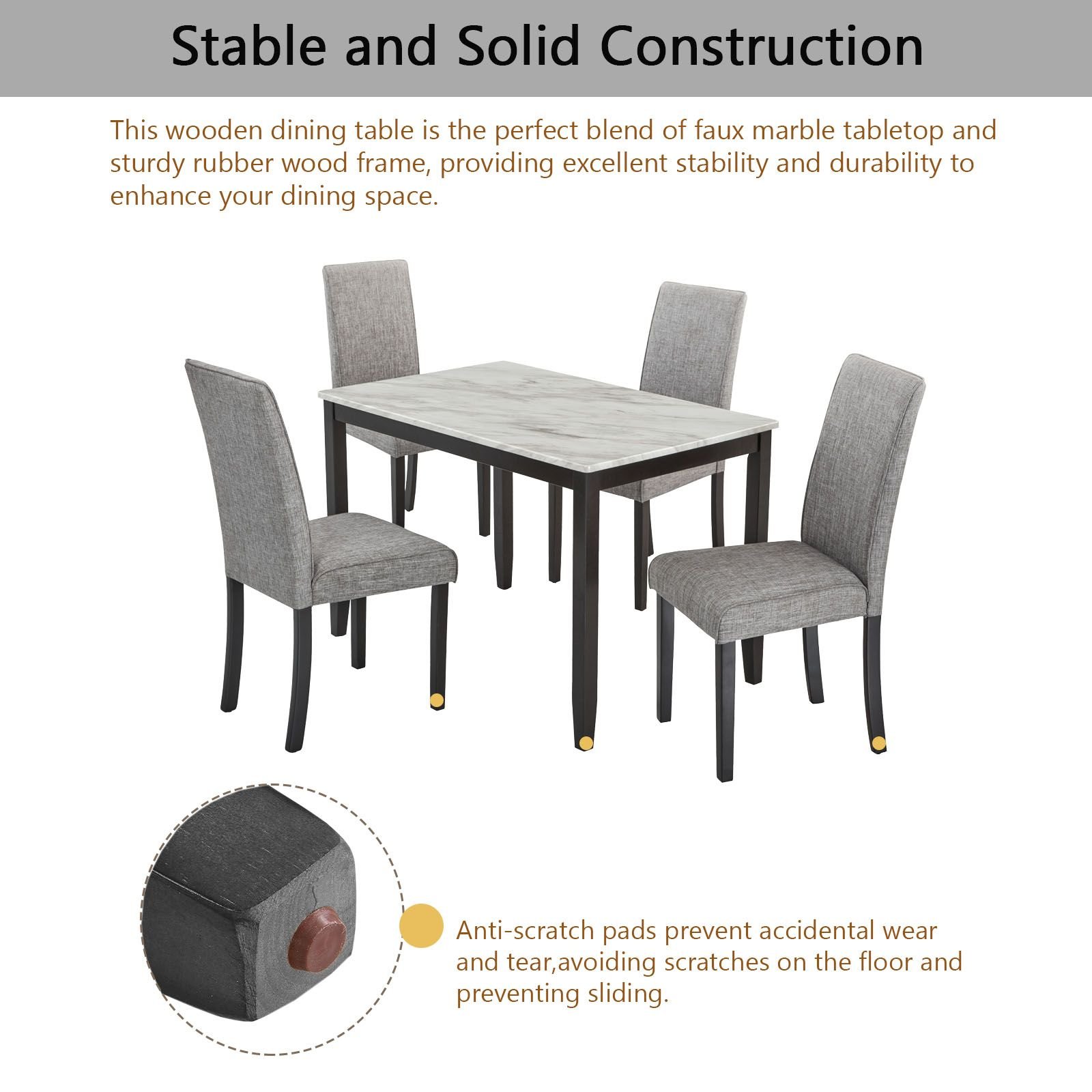 5 Pieces Dining Table Set: This dining table set includes a gorgeous rectangular faux marble table and four stylish upholstered dining chairs. It's perfect for families and guests alike! The faux marble dining table is not only a stunning visual treat but also a practical choice. The coated and finished table top is stain resistant and can be easily cleaned with a damp cloth. Effortlessly maintain a glossy and smooth finish to create an impeccable dining space.