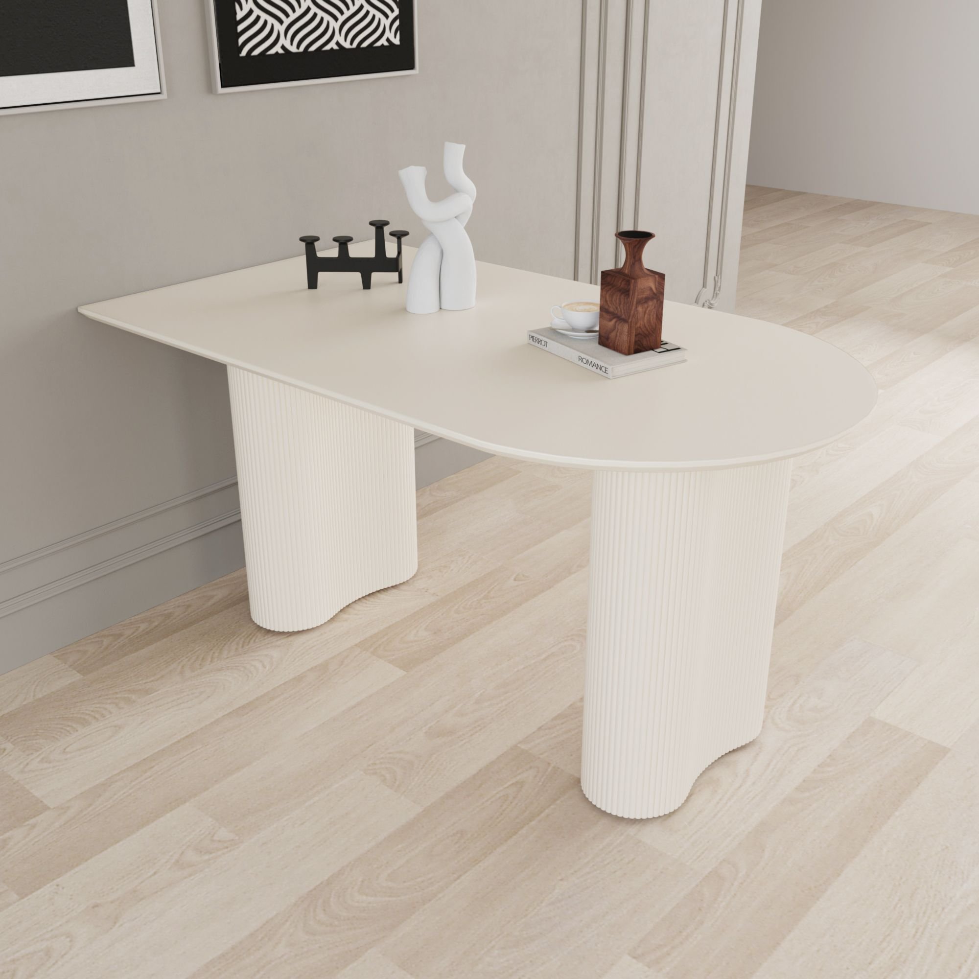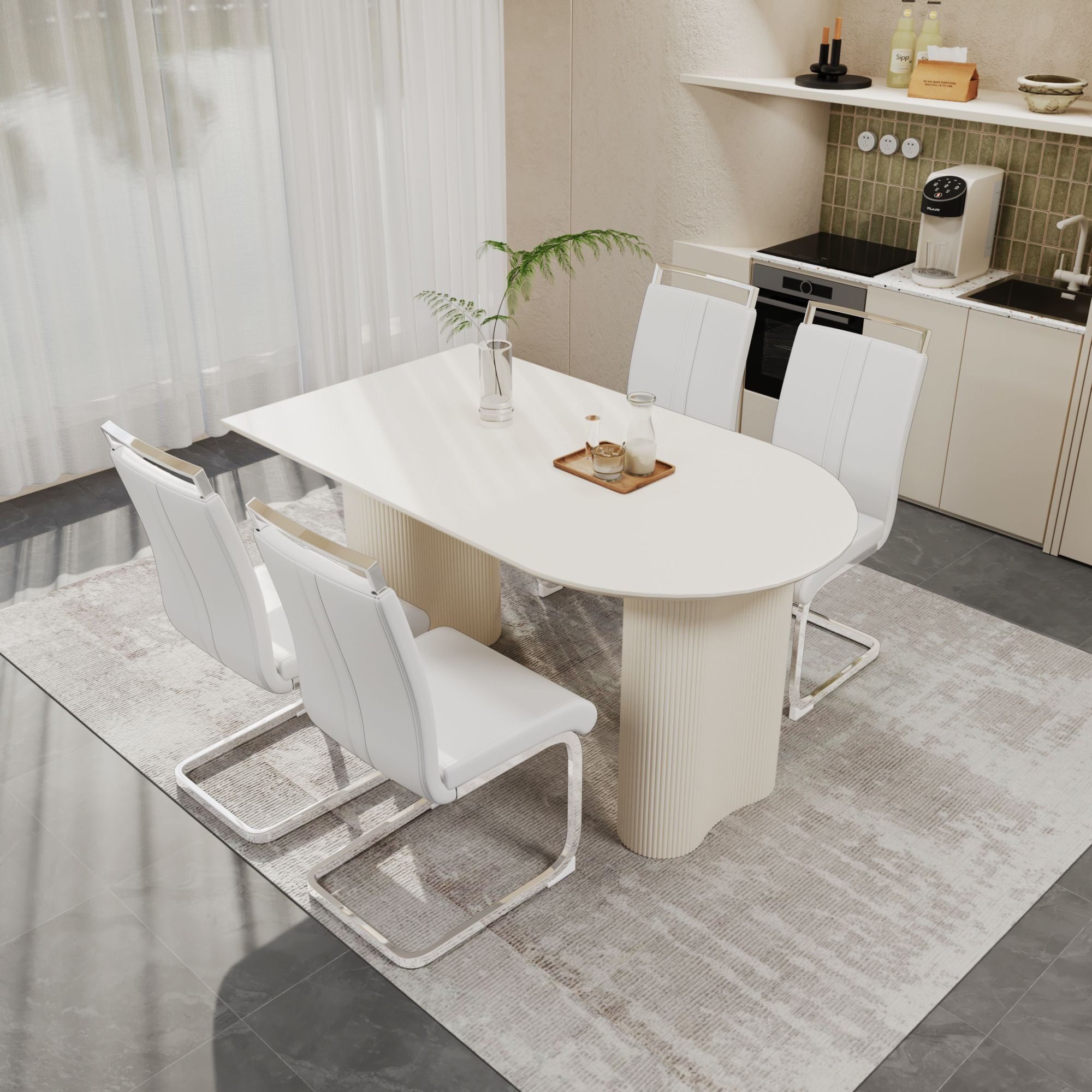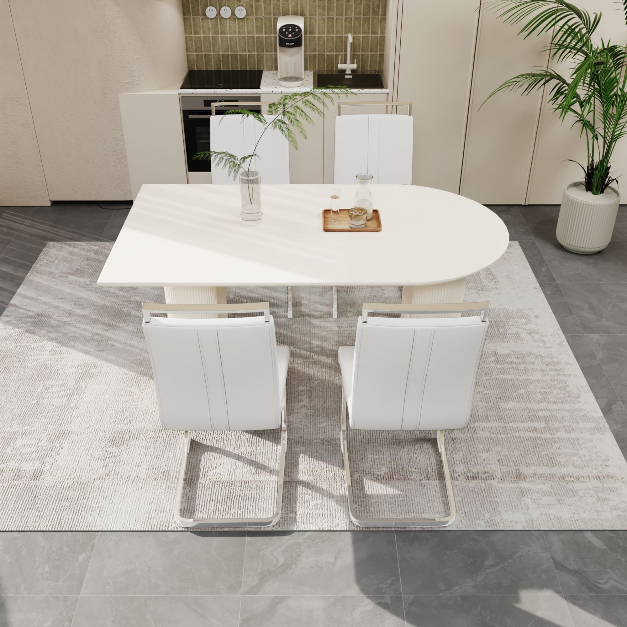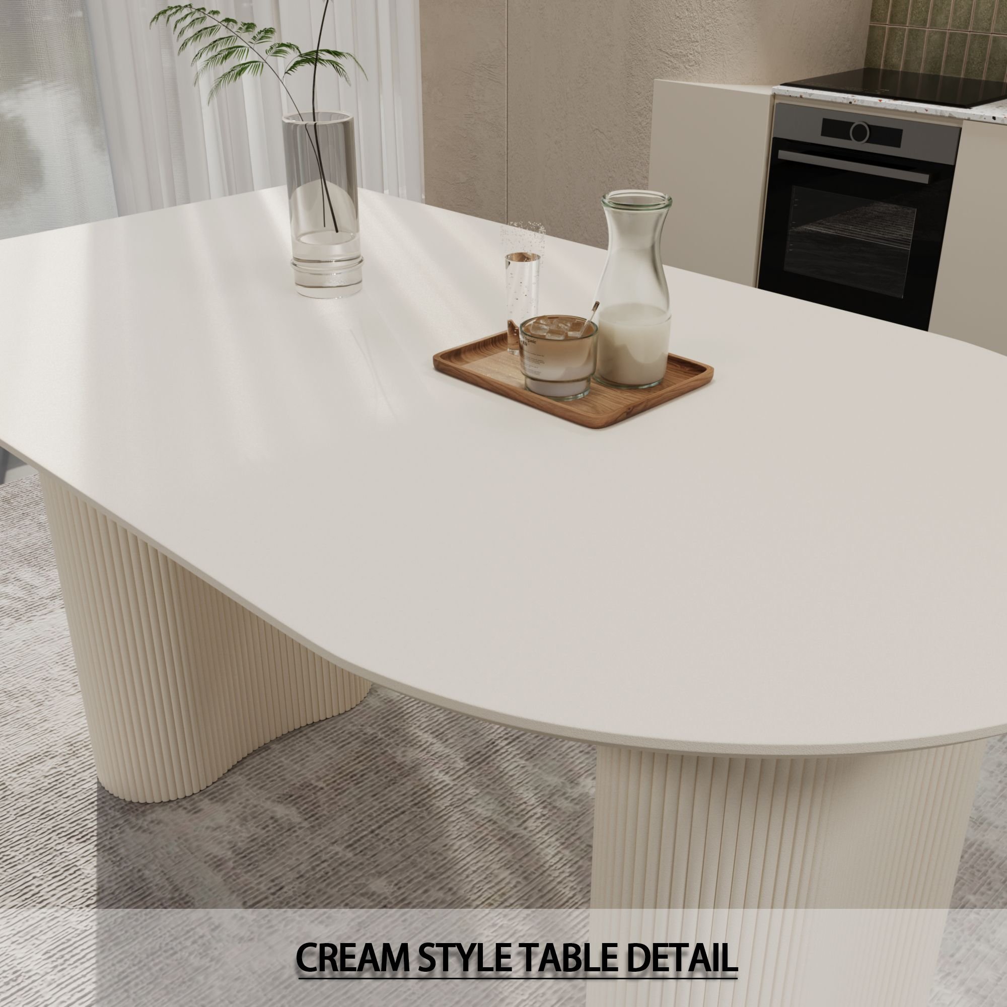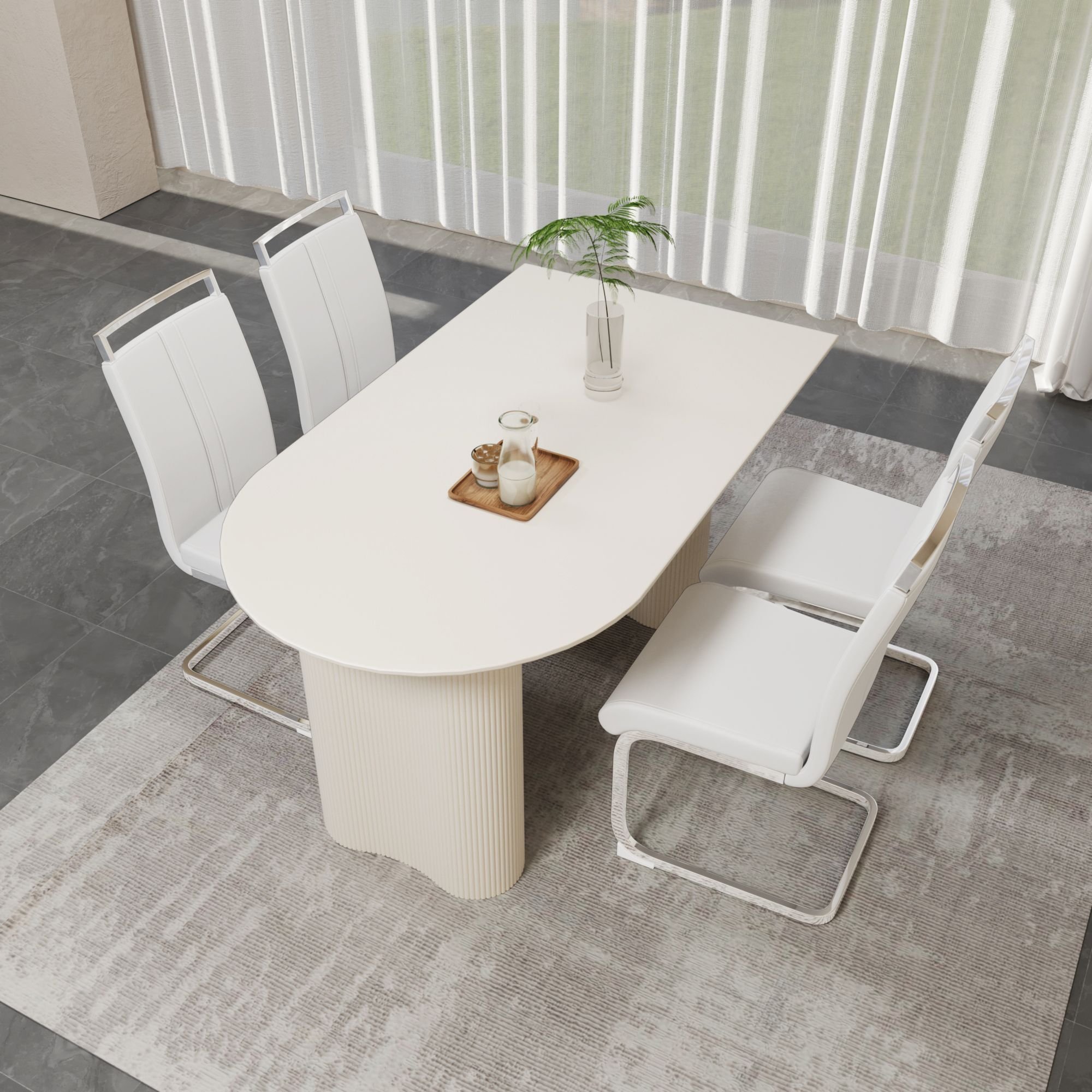 3.A multifunctional dining table and chair set suitable for gatherings of multiple people: Our multifunctional and spacious MDF cream colored dining table features exquisite and thick wavy legs to enhance your dining experience. Paired with elegant and practical armless dining chairs, it can further enhance your dining comfort, aiming to enhance your lifestyle and gathering experience.