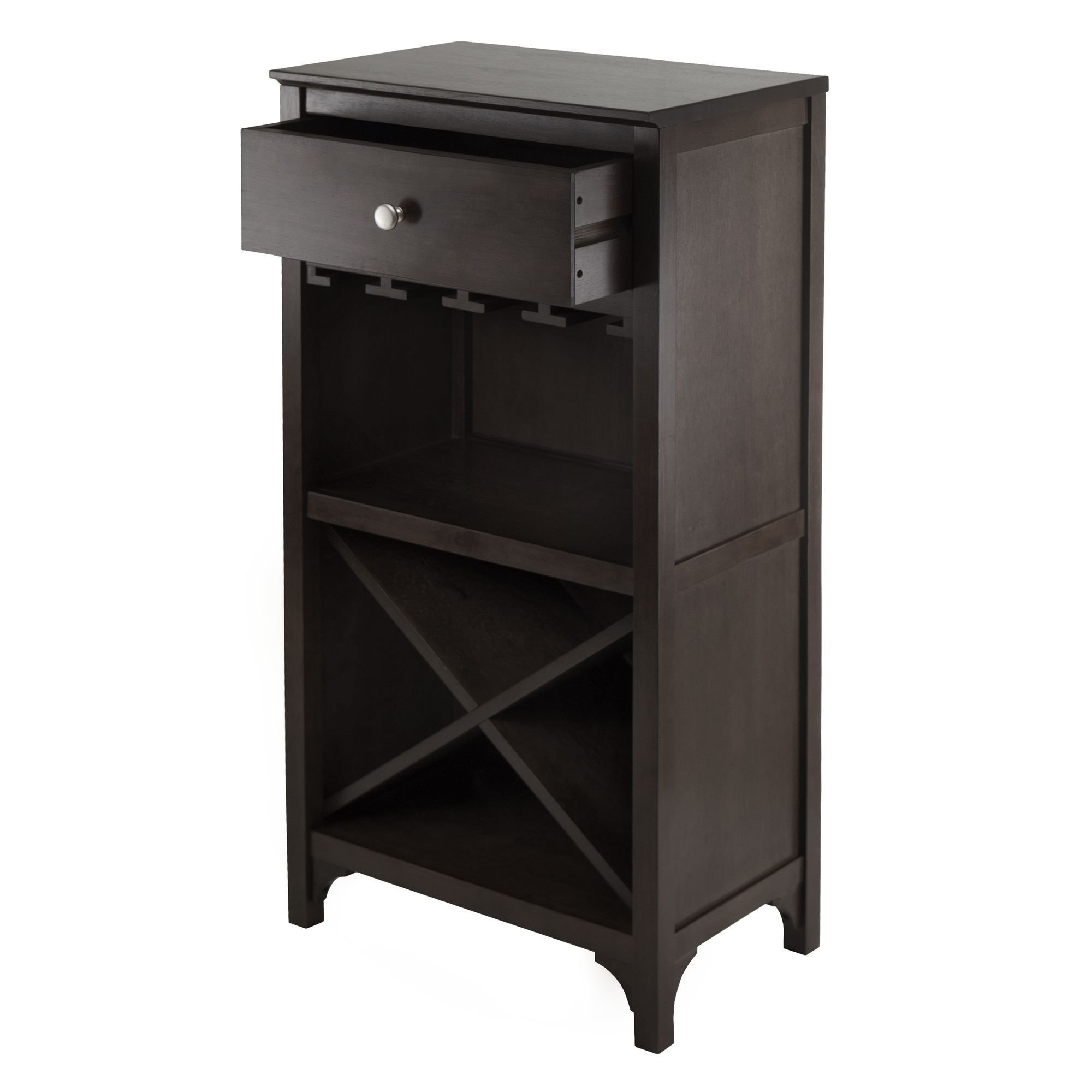 Add this compact Ancona Wine Modular unit to your home. Create a unique look with one unit or any combination of the three styles available. This unit has a drawer for your accessories; glass hangers and X wine storage. Overall assembled size is 19.009"W x 12.60"D x 37.52". Insider drawer dimension is 15.47"W x 9.25"D x 4.65"H. Glass Hanger inside clearance is 16.73"W x 11.10"D x 9.06"H. Four sections of wine storage. Made with combination of solid and composite wood in Dark Espresso Finish. Assembly Required.Overall size 19.009"W x 12.60"D x 37.52". Insider drawer dimension is 15.47"W x 9.25"D x 4.65"H.Glass Hanger inside clearance is 16.73"W x 11.10"D x 9.06"H. Four sections of wine storage.Made with combination of solid and composite wood in Dark Espresso Finish. Assembly Required.nullnullnull This product meets the oversized requirement per UPS/FedEx. The shipping weight reflected is the dimensional weight. This product also meets the large package requirement per UPS/FedEx. The estimated shipping cost will include this fee. Large package is $70.00; applied when length plus girth [(2 x width) + (2 x height)] combined exceeds 130 inches. Additional Handling charge of $10.50 applied where a package's longest side exceeds 48 inches in length; the second longest side exceeds 30 inches in length; or total weight is greater than 70 lbs.This product meets the oversized requirement per UPS/FedEx. The shipping weight reflected is the dimensional weight. This product also meets the large package requirement per UPS/FedEx. The estimated shipping cost will include this fee. Large package is $70.00; applied when length plus girth [(2 x width) + (2 x height)] combined exceeds 130 inches. Additional Handling charge of $10.50 applied where a package's longest side exceeds 48 inches in length; the second longest side exceeds 30 inches in length; or total weight is greater than 70 lbs.