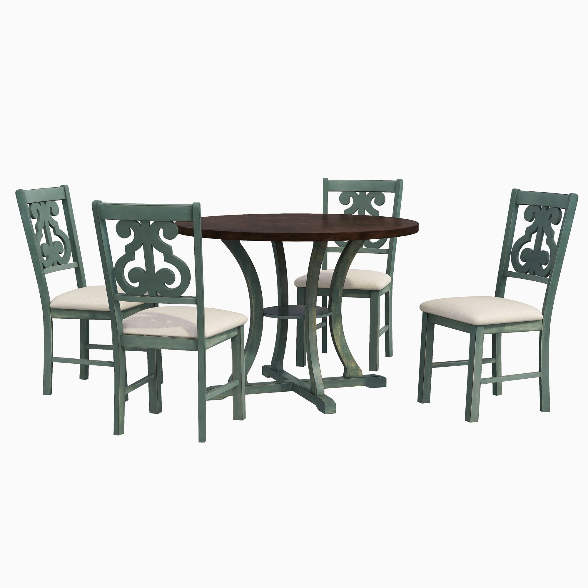 Retro-style This is a set of dining table and chair furniture with hollowed-out carving patterns on the back of the chair. The fresh, simple and retro design is the crowning touch of your restaurant. The wood grain details of the table top and the soft cushion filled with high-density NEW FOAM perfectly combine this set of furniture, which can add a variety of design aesthetics to your restaurant, kitchen area or family bistro.