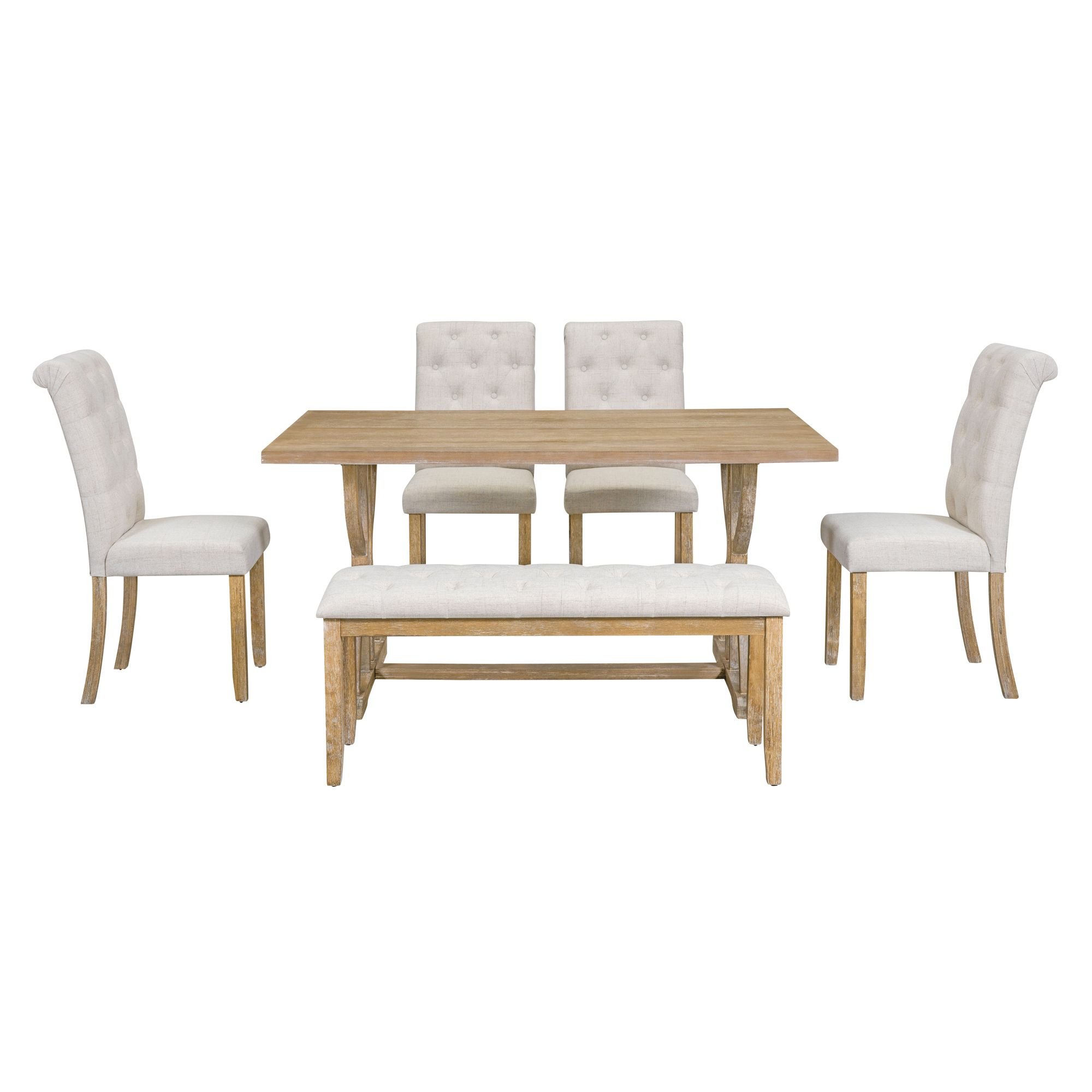 Retro StyleThe 6-piece dining table set with its retro and elegant appearance will definitively redefine your dining and living space. The tabletop is in a simple rectangular design, and its combination of rigidity and softness makes the artistic sense stronger. Its timeworn planked ash top creates a unique two-tone contrast, while special designed legs and stretcher provide a sturdy foundation. Four solid wood dining chairs and one matching dining bench complete this excellent combo item.