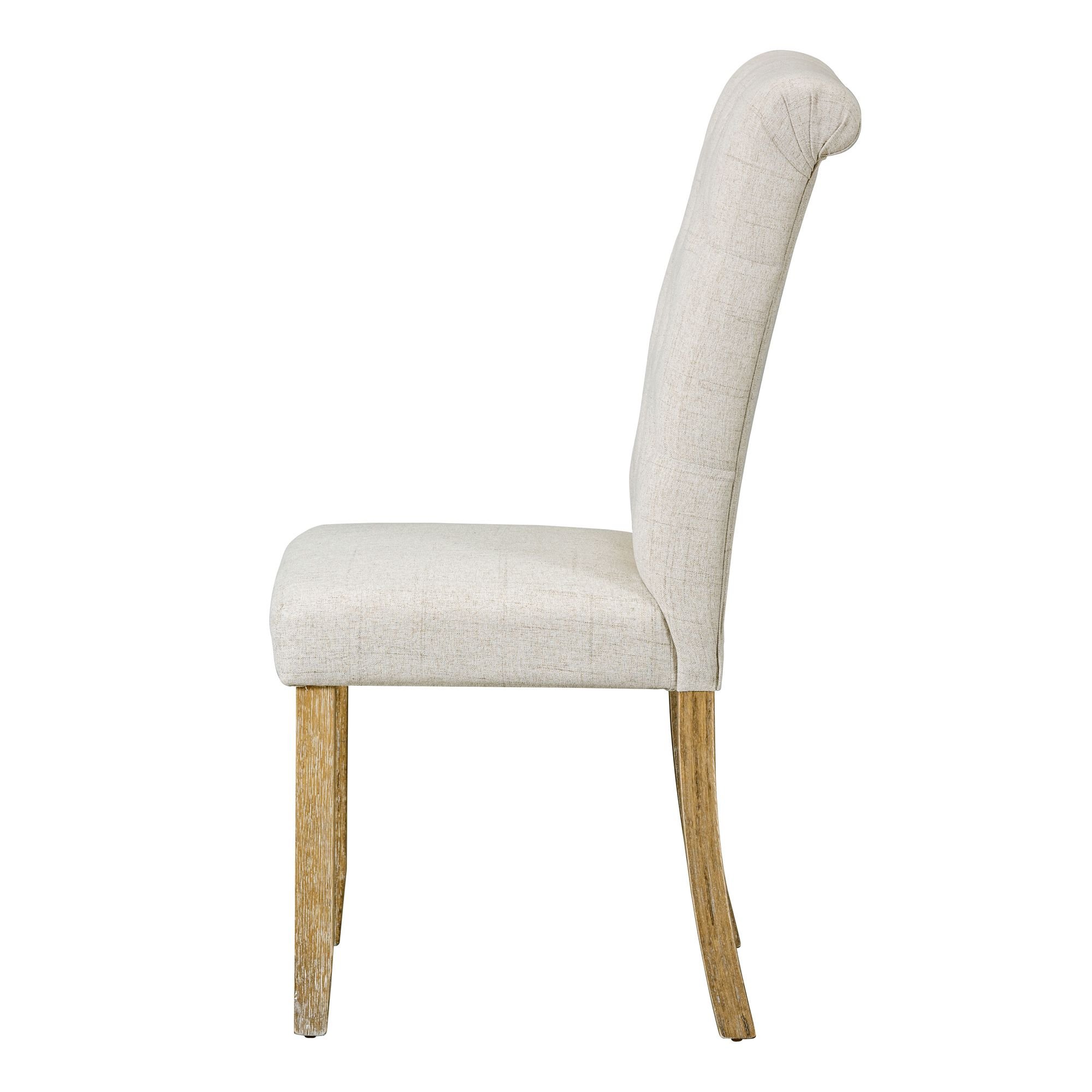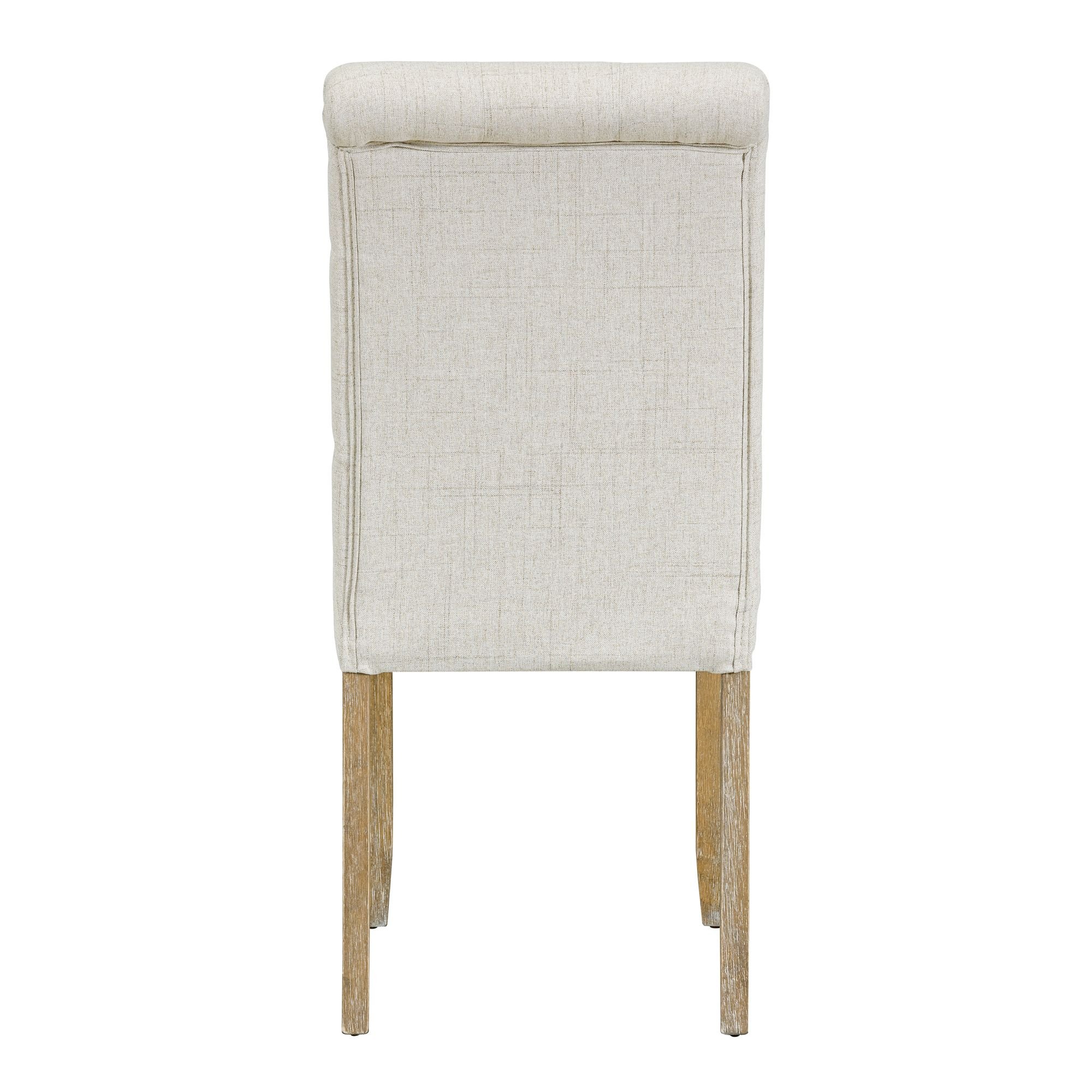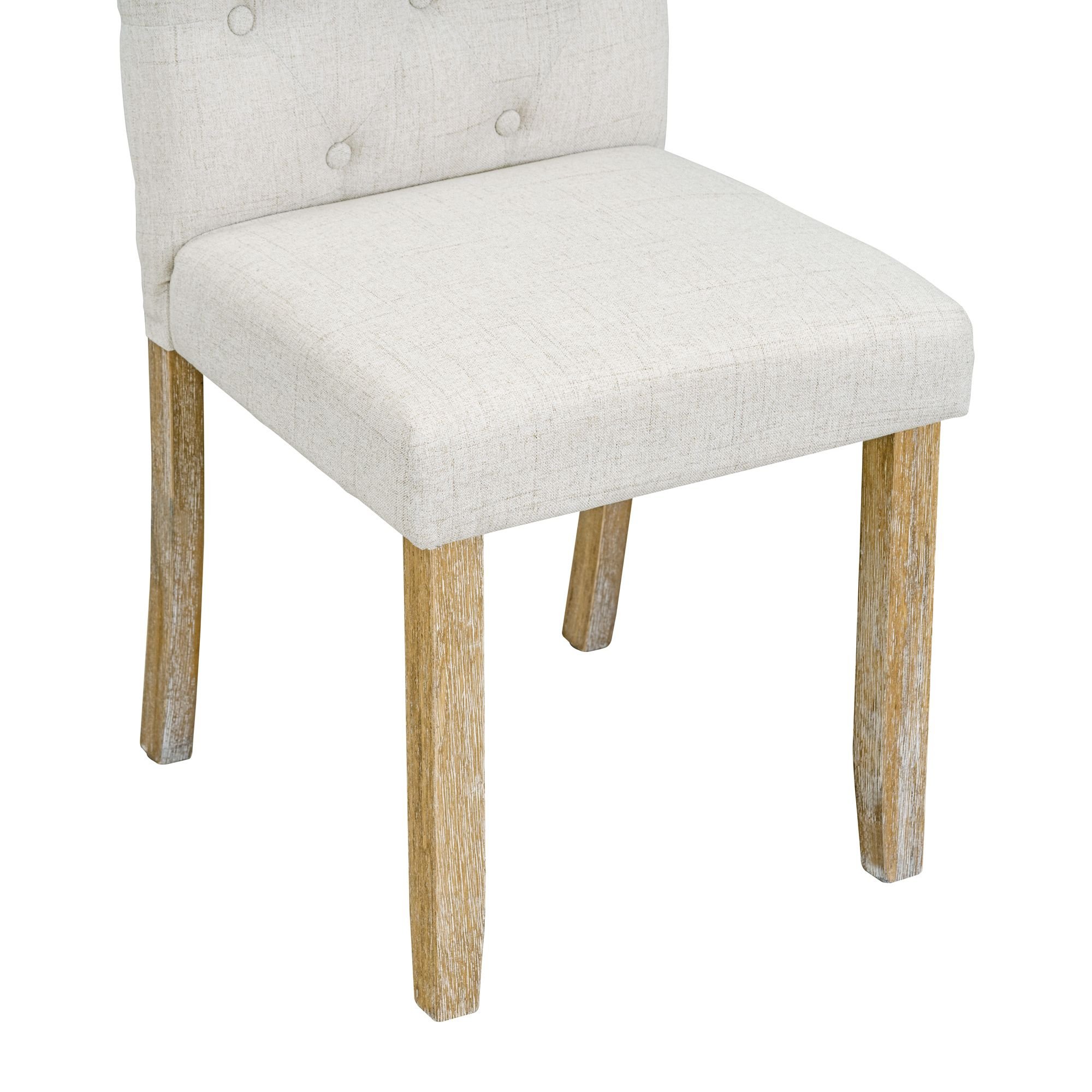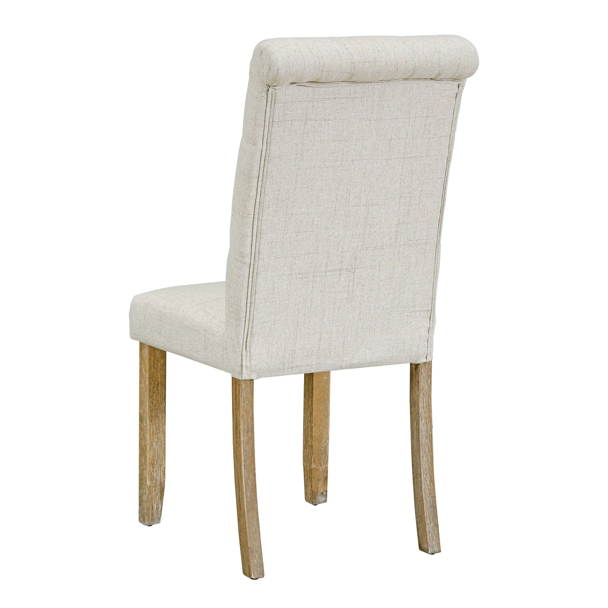 The natural wood wash and grey finish add a distinctly rustic look that easily updates any household. Special symmetrical pattern design for table legs and button-tufting design of the seating set undoubtedly showcase a classic look, featuring an elegant and retro flair. Thick upholstered backrests of chair sets are in line with ergonomic design, thus bringing superb comfort. Whether used for chic dinner parties or casual family dinners, the dining set is sure to elevate any dining experience.
