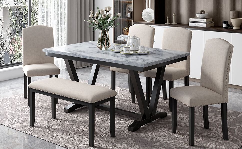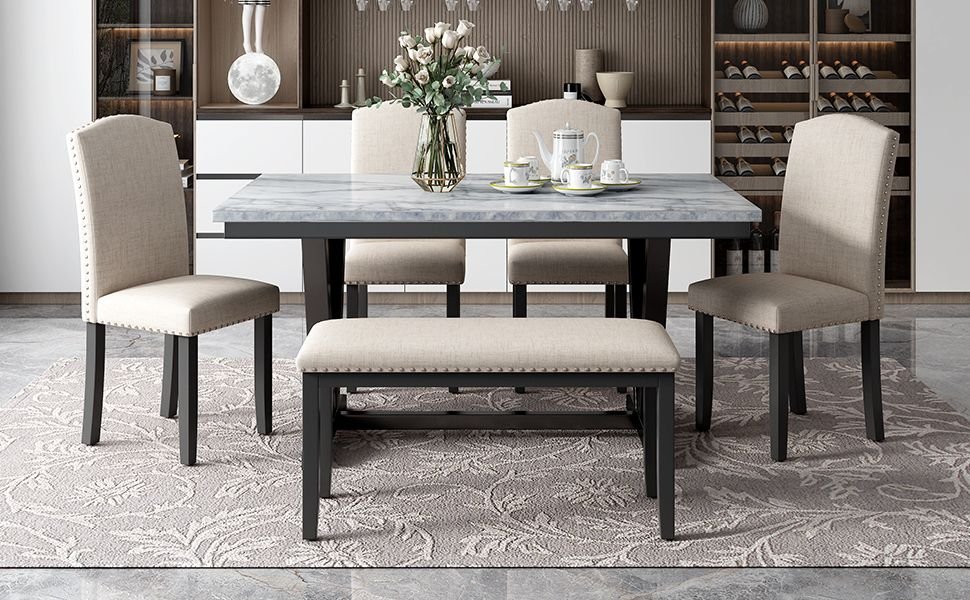 Six-person Configuration: This elegant style dining table set is including a table topped with marble decals, four high back upholstered chairs and a soft covered bench. In that case, this dining table set can serve six people, and it means this simple and elegant dining table set is fit for big families. This dining table set allows all family members to sit together and enjoy vittles and beverages and the warm and harmonious atmosphere of the family.